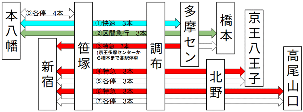 また、北野~京王八王子・高尾山口間は特急が各駅に停車するため、この区間は各駅毎時6本になっています。