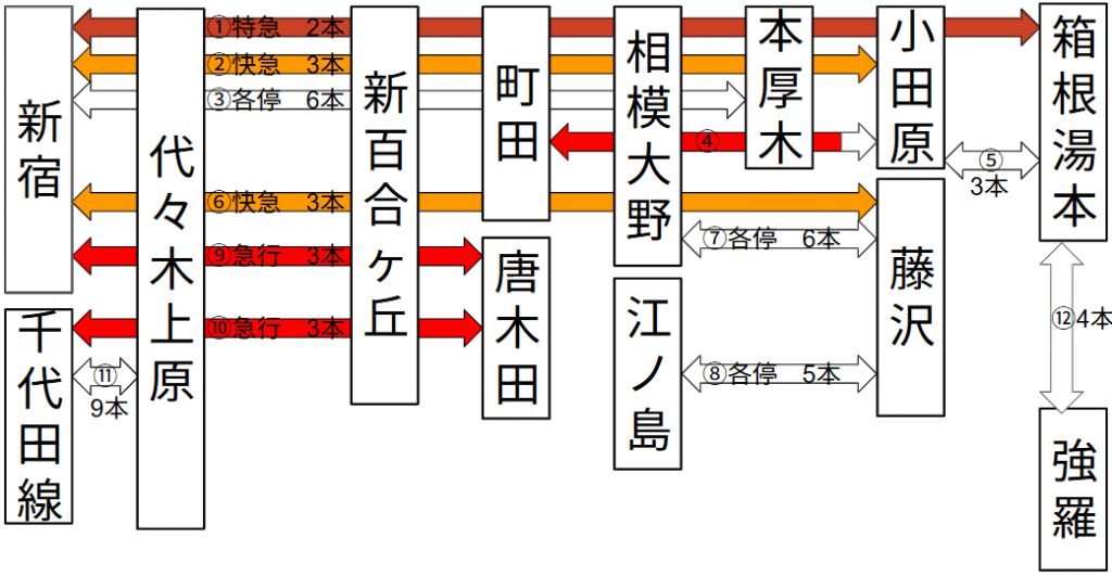 新宿20分・箱根湯本10分発…町田、海老名、伊勢原、小田原です。たまに例外あり。