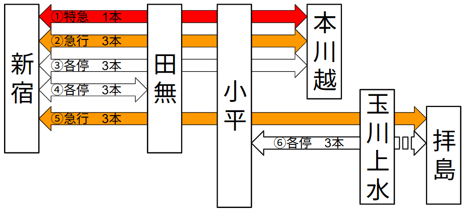 ③…小平から先は②と合わせて10分間隔です。鷺ノ宮(上りは上石神井)で②に、小平で⑤を待ち合わせします。