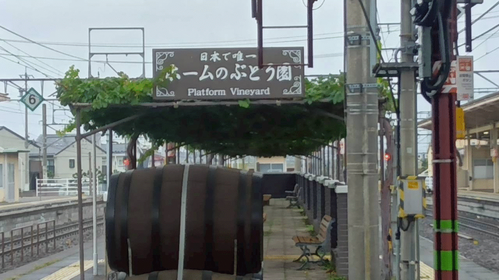 木曽福島で大量の外国人観光客が乗車し、塩尻まで立ち客も大勢いました。その後転線を繰り返して塩尻駅の4番線に到着。塩尻駅ではホームにぶどう園があり、記念撮影をしてきました。