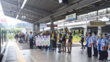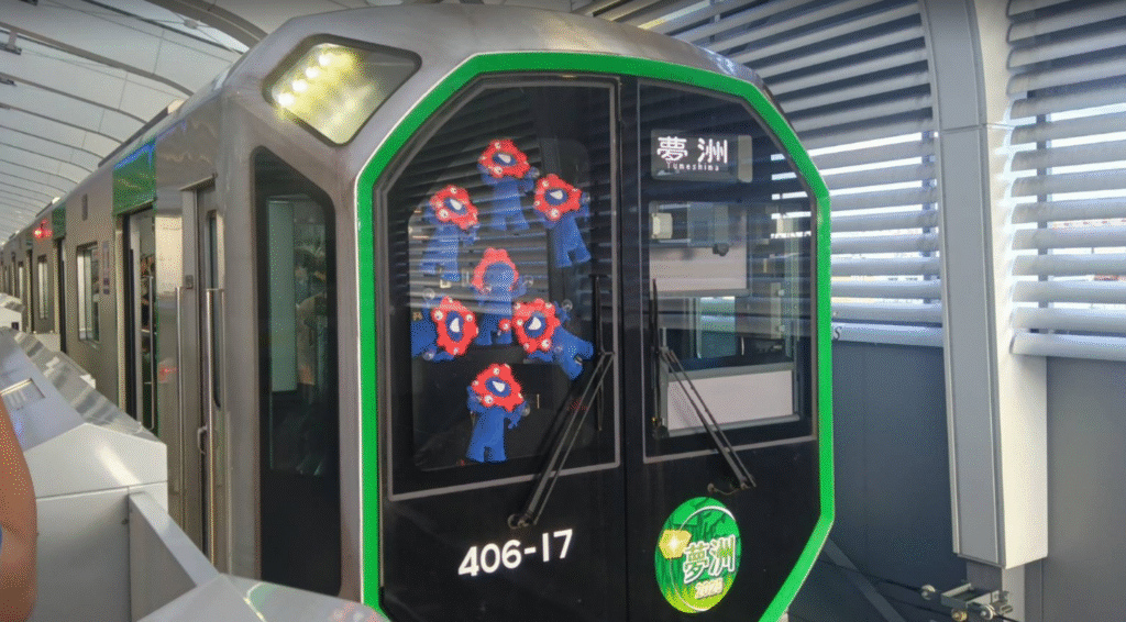 そして、次の電車で弁天町を出ると、地上駅でたくさんの鉄道ファンと思われる人たちがいたため、試しに下車してみたところ… ミャクミャクが大量に感染している編成が来ました。