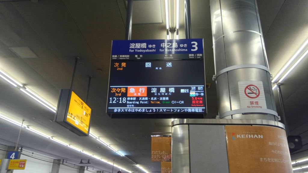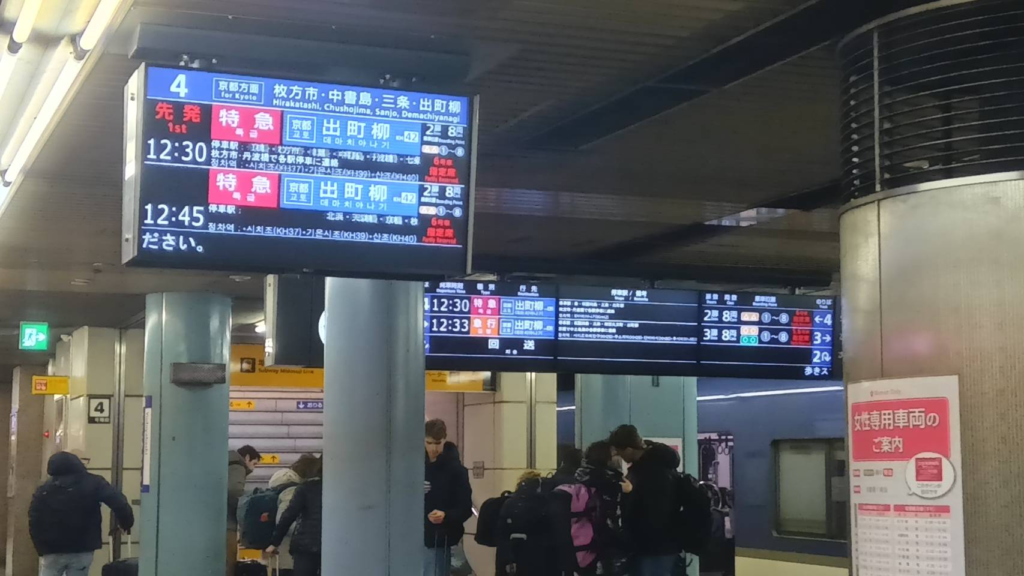 12時10分に京橋駅へ向かった私は、初詣に行くために石清水八幡宮を目指しました。正月ダイヤでは、急行はプレミアムカーがあるものとないもの両方が走っていました。