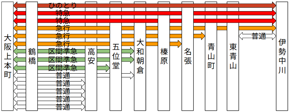 この会社が最も大きな変更があります。現在大阪線では次のようなダイヤとなっています。
