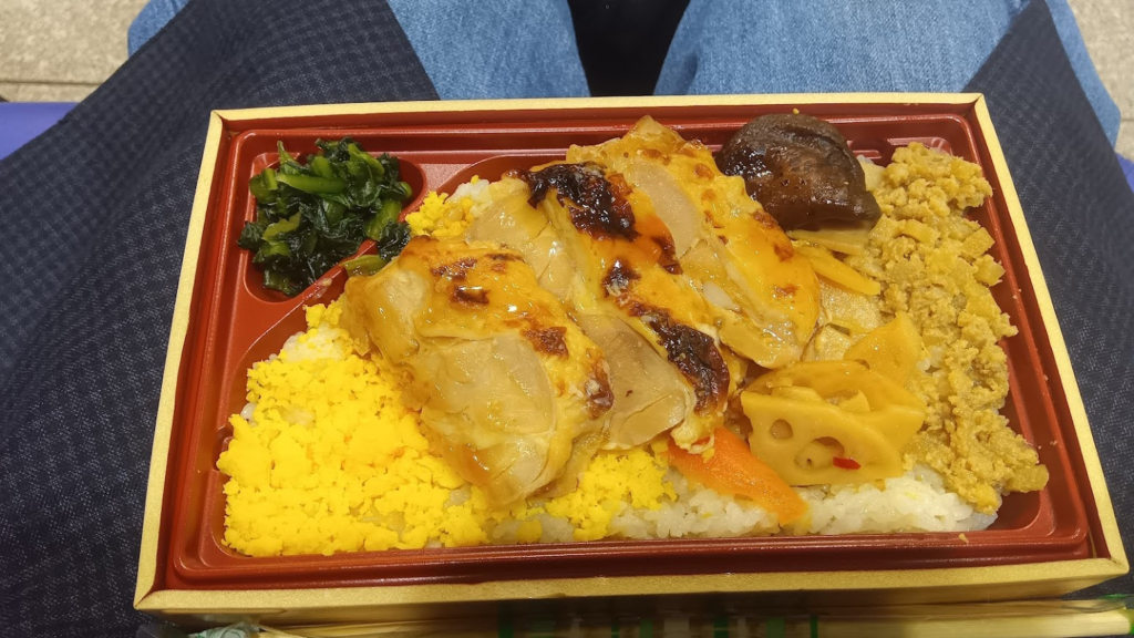 そして待合室で新幹線を待っていたのですが、全然来ないため夕食を先に食べました。