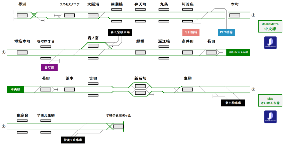この路線は、大正から心斎橋、京橋を経由して門真南までを結ぶ路線です。鶴見緑地にある検査場からは今里筋線(後ほど解説)と連絡線でつながっています。