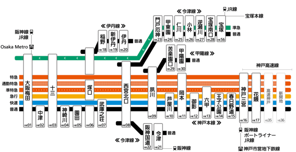 神戸線とは、梅田から西宮北口、岡本を経由して神戸三宮までを結ぶ路線です。神戸三宮からは神戸高速線に直通しており、特急は新開地まで直通します。