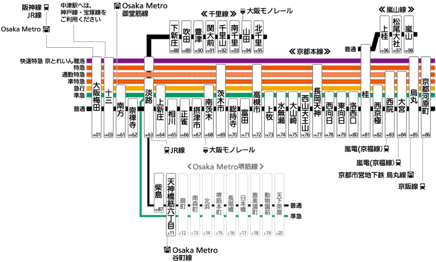 京都線とは、大阪梅田から淡路、高槻市を経由して京都河原町まで向かう路線です。途中の淡路で千里線に、桂で嵐山線に乗り換えできます。ダイヤは10分ヘッドで、普通、準急、特急の3つの種別が来ます。