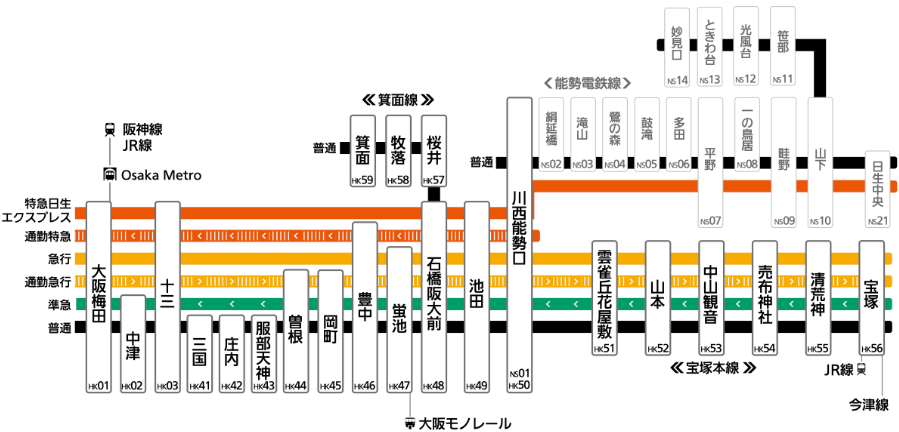 宝塚線は、梅田から豊中、池田を経由して宝塚まで至る路線です。石橋阪大前で箕面線に、川西能勢口で能勢電鉄に乗り換えできます。